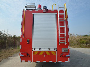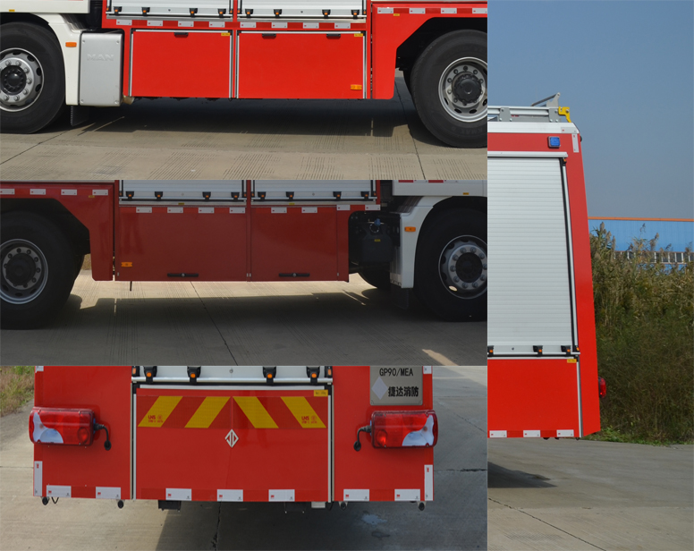 整車備注:罐體總容積為8.912立方米,水罐容積:5.0立方米,水罐尺寸:1495×2400×1460mm,泡沫液罐容積:1.912立方米,泡沫液罐尺寸:1445×950×1460mm,干粉罐容積:2.0立方米,干粉罐尺寸(直徑×高):690×1400mm。整體式側后防護結構,后防護離地高度:480mm。ABS生產企業為KNORR,型號為0 486 106。主要專用裝置有消防泵、消防炮、干粉系統。