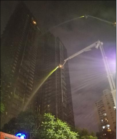 不久,現(xiàn)場(chǎng)消防車增至22輛、消防官兵增至110多名。兩臺(tái)消防高噴車在外圍控制了火勢(shì)蔓延。消防員攜帶救援器材,繼續(xù)徒步上樓,逐層內(nèi)攻搜索排查。至21時(shí)45分,火災(zāi)被完全撲滅。